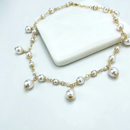 Set Pearls Linked Necklace and Dangle Pearls & Dangle Pearls Earrings 18k Gold Filled