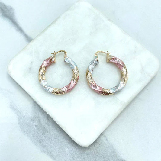Earrings Hoop 3 Tone, Yellow Gold, White Gold, Rose Gold. Flat Texturized Diamond Cut Design 18k Gold Filled