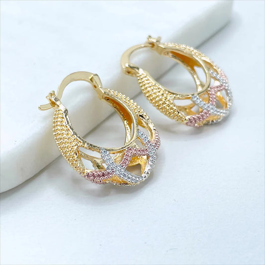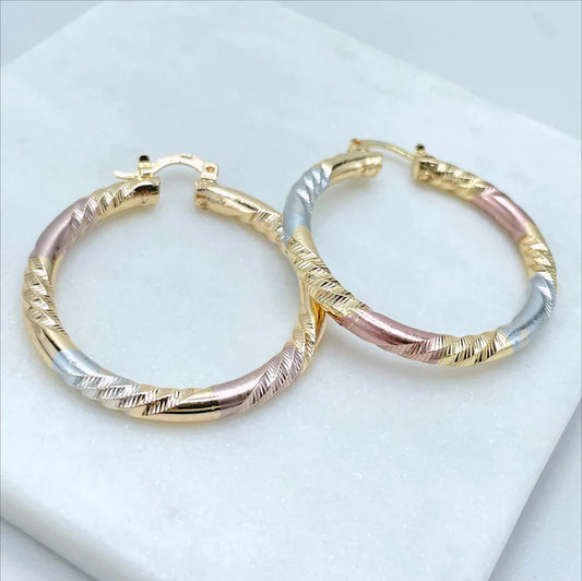 Earrings Hoop 3 Tone, Yellow Gold, White Gold, Rose Gold. Flat Texturized Diamond Cut Design 18k Gold Filled