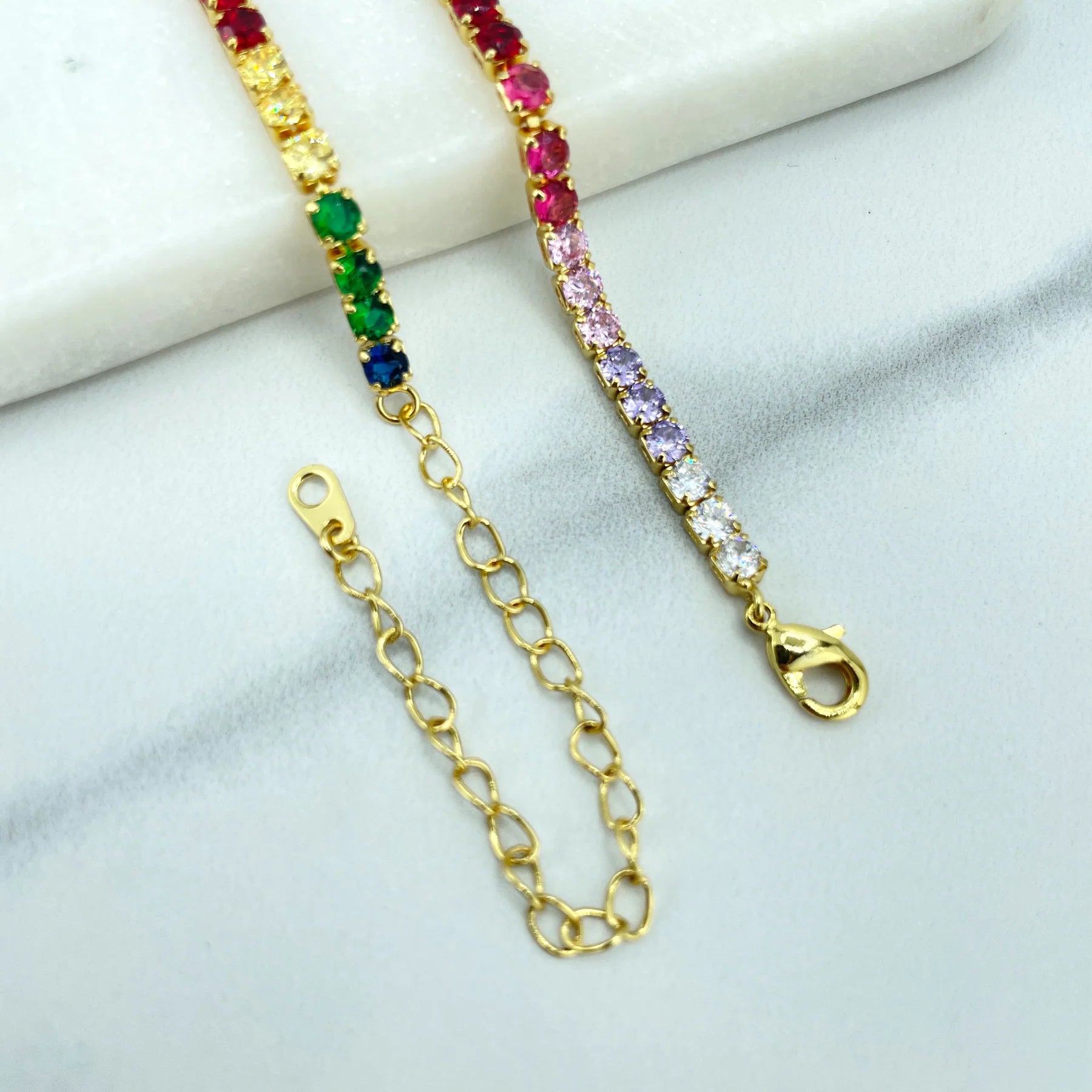 This exquisite 18k Gold Filled choker necklace is perfect for any special occasion or everyday wear. Featuring a beautiful rainbow tennis cubic zirconia design and an extender, this necklace will provide you with a chic and stunning look.